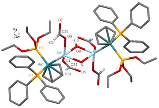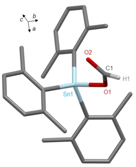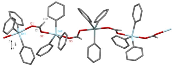 Solid-state structures of tin(IV) formate complexes were established from the 1980s. In 1987, Molloy et al. reported the crystal structure of triphenyltin formate prepared from a mixture of triphenyltin hydroxide and formic acid in refluxing toluene []. [Ph3Sn(O2CH)]n is organized in a polymeric chain propagating along c axis and compared by the authors to a flattened helix. Triphenyltin moieties are bridged by bidentate formate ligands (CSD refcode: FAJZIZ, 1151980; Figure 6). In 1990, Mistry et al. resolved the structure of bis(formato)dimethyltin(IV), [Me2Sn(O2CH)2]n, which was described as a sheet polymer with linear Me2Sn moieties nearly symmetrically bridged by formate anions. Sn atoms exhibit an octahedral geometry (CCDC ref.: SIFLEY, 1258788; Figure 7) []. More recently, Power et al. published the synthesis and characterization of several organotin(IV) formates prepared from hydrides and hydroxides of organotins in the presence of formic acid []. X-ray crystallographic structures investigations were conducted on five compounds. [n-Bu2Sn(O2CH)2]n (CCDC ref.: EKONEY, 783726; Figure 8), [(PhCH2)3Sn(O2CH)]n (CCDC ref.: EKONAU, 783725), and [Cy3Sn(O2CH)]n (Cy = cyclohexyl) (crude structure owing to the low quality of crystals) exhibit polymeric structures, while Mes3SnOC(O)H (Mes = 2,4,6-trimethylphenyl) (CCDC ref.: EKONOI, 783728) and Dmp3SnOC(O)H (dmp = 2,6-dimethylphenyl) (CCDC ref.: EKONIC, 783727; Figure 9) are monomeric tin formates. In 2010, McMurtie and Arnold reported the crystal structure of meso-tetraphenylporphyrinatotin(IV) diformate, prepared from Sn(TPP)(OH)2 (TPP = dianion of 5,10,15,20-tetraphenylporphyrin) and formic acid, and in which the central tin atom exhibits an octahedral geometry with two axially O-coordinated formato ligands (Figure 10) [].