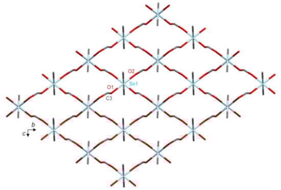 Infinite sheets based-structure of [Me2Sn(O2CH)2]n (CCDC ref.: SIFLEY, 1258788), adapted from [] (MERCURY view). Hydrogen atoms are omitted for clarity (Sn light blue, O red, C grey).