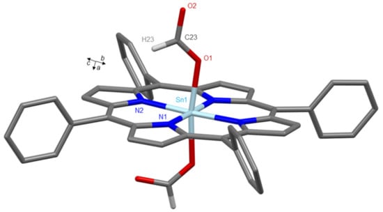- McMurtie, J.C.; Arnorld, D.P. Tin(IV) porphyrin complexes. Crystal structures of meso-tetraphenyl-porphyrinatotin(IV) diacetate, bis(dichloro-acetate), bis(trifluoroacetate) and diformate, and structural correlations for tin(IV) porphyrin complexes with O-bound anionic ligands. J. Struct. Chem. 2010, 51, 107–113. [Google Scholar] [CrossRef]