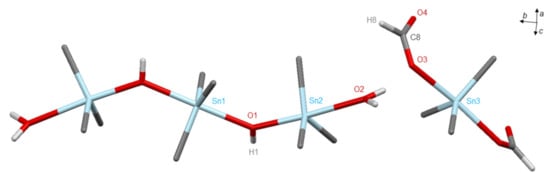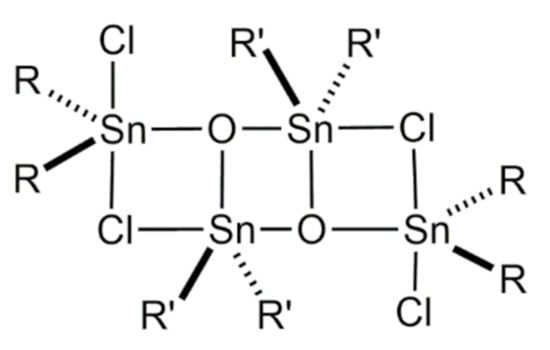 - Otte, F.; Koller, S.G.; Golz, C.; Strohmann, C. Crystal structures of diaquadi-μ-hydroxido-tris[trimethyltin(IV)] diformatotrimethylstannate(IV) and di-μ-hydroxido-tris[trimethyltin(IV)] chloride monohydrate. Acta Cryst. 2016, E72, 1499–1502. [Google Scholar] [CrossRef]