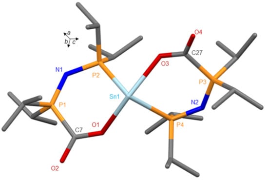 From a coordination point of view, the authors preferentially recommended the representation of the carbamato ligand as N-coordinated to tin, in amido form, but did not exclude an O-coordination, in imido form, via an interconversion process. Subsequently, this structural consideration was the subject of several subsequent works, involving other research groups, and based on studies carried out by 119Sn Mössbauer spectroscopy [], as well as more recently by computational calculations [].
