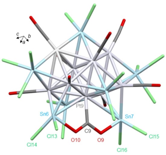 - Bortoluzzi, M.; Ceriotti, A.; Ciabatti, I.; Della Pergola, R.; Femoni, C.; Iapalucci, M.C.; Storione, A.; Zacchini, S. Platinum carbonyl clusters stabilized by Sn(II)-based fragments: Syntheses and structures of [Pt6(CO)6(SnCl2)2(SnCl3)4]4−, [Pt9(CO)8(SnCl2)3(SnCl3)2(Cl2SnOCOSnCl2)]4− and [Pt10(CO)14{Cl2Sn(OH)SnCl2}2]2−. Dalton Trans. 2016, 45, 5001–5013. [Google Scholar] [CrossRef] [PubMed]