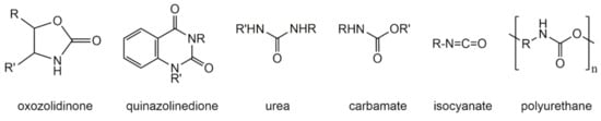 Among the useful chemicals with higher added-value which can be produced by the transformation of CO2, the derivatives involving C–N bonds occupy an important place, historically and economically. Thus, from 1922, the German Bosch-Meiser process allowed the industrial use of carbon dioxide (together with ammonia) as raw material for the synthesis of urea [(NH2)2CO]. It is still today the most important industrial chemical process in terms of CO2 amounts converted (115 Mt) []. Since then, the use of carbon dioxide as C1 synthon has been extended to the synthesis of other types of nitrogen compounds such as oxazolidinones, quinazolinediones, ureas, carbamates, isocyanates and polyurethanes (Scheme 1). These molecules constitute intermediates and derivatives of great importance for the chemical, agrochemical and pharmaceutical industry. The domain was firstly reviewed by He et al. in 2012 [], and recently updated by Song et al. [] and then by Dalpazzo et al. [], both in 2019. In most cases, the intervention of a catalytic precursor—organic or organometallic, is required to achieve the targeted product.