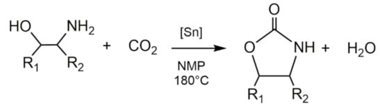 - Tominaga, K.-I.; Sasaki, Y. Synthesis of 2-oxazolidinones from CO2 and 1,2-aminoalcohols catalyzed by n-Bu2SnO. Synlett 2002, 2, 307–309. [Google Scholar] [CrossRef]