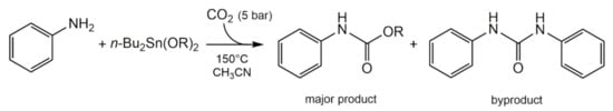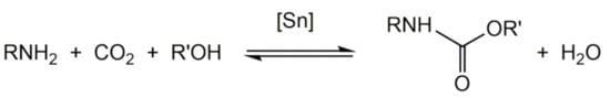 In the past, several groups investigated the action of organotins as catalyst precursors for the direct conversion of CO2 into carbamates. In 2001, Sakakura et al. first published the synthesis of carbamates by reaction of amines and alcohols catalyzed by tin complexes (n-Bu2SnO and Me2SnCl2) [] (Scheme 5). Optimal reaction conditions require a pressure of 30 MPa (300 bar) at 200 °C for 24 h. Moreover, the addition of acetals (2,2-diethoxy- or 2,2-dimethoxypropane) acting as a dehydrating agent significantly improves the conversion, and the increase in pressure promotes the urethane selectivity.