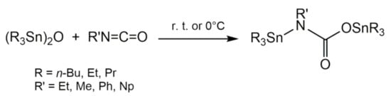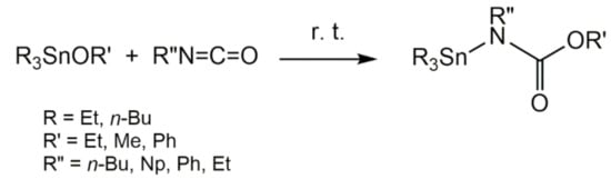 Historically, the pioneering works on carbamates of tin derivatives dates back to the 1960s and are to be credited to A. J. Bloodworth and A. G. Davies who conducted extensive and fundamental investigations applying a systematic approach. From 1965, they described the synthesis of N-organo-N-trialkylstannylcarbamates resulting from the addition of trialkyltin alkoxides to isocyanates []. The reactions were reported as rapid and exothermic and taken place at room temperature (Scheme 7). Alkyl and aryl isocyanates exhibit a comparable reactivity.