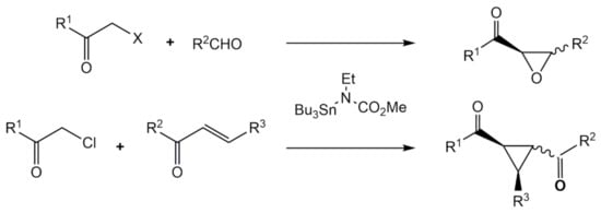 - Shibata, I.; Yamasaki, H.; Baba, A.; Matsuda, H. A novel Darzens-type reaction promoted by tributylstannylcarbamate. J. Org. Chem. 1992, 57, 6909–6914. [Google Scholar] [CrossRef]