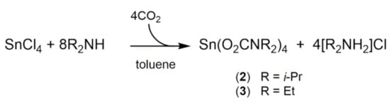 Thereafter, with the aim of applications in heterogeneous catalysis, Calderazzo et al. reported the preparation of two N,N-dialkylcarbamato tin(IV) complexes, Sn(O2CNi-Pr2)4 (2) and Sn(O2CNEt2)4 (3), which were used as precursors for the chemical implantation of metal cations on a silica support []. The grafting method consisted of promoting reactivity of N,N-dialkylcarbamates with silanol groups of silica. Compounds 2 and 3 were synthesized by treating anhydrous Sn(IV) chloride with diethylamine and di-iso-propylamine, respectively, in toluene at room temperature, under atmospheric pressure of carbon dioxide (Scheme 10). Yields higher than 90% are reported.