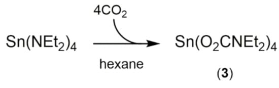 Recrystallized from heptane, suitable single crystals of 2 were analyzed by X-ray diffraction leading to the resolution of the crystallographic structure. In 2002, in the frame of metal-organic chemical vapor deposition (MOCVD) investigations, Molloy et al. described a new synthetic route to 3, starting from a solution of tetrakis(N,N-diethylamino)tin(IV) complex in hexane that was bubbled with carbon dioxide (Scheme 11) [].