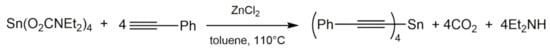 Reaction of tetrakis(N,N-diethylcarbamato)tin(IV) with phenylacetylene leading to tetra(phenylethynyl)tin, data from [].