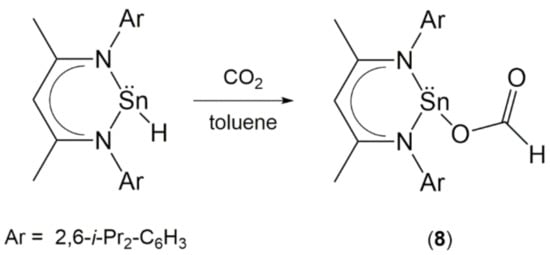 - Jana, A.; Roesky, H.W.; Schulzke, C.; Döring, A. Reactions of tin(II) hydride species with unsaturated molecules. Angew. Chem. Int. Ed. 2009, 48, 1106–1109. [Google Scholar] [CrossRef] [PubMed]
