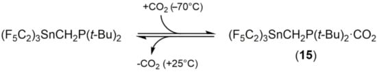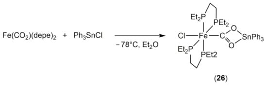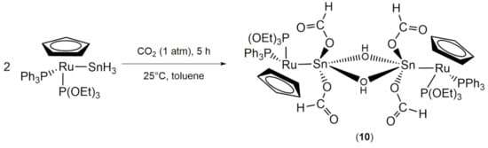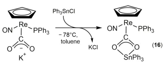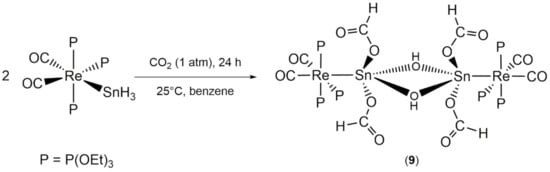 - Gibson, D.H.; Ye, M.; Sleadd, B.A.; Mehta, J.M.; Mbadike, O.P.; Richardson, J.F.; Mashuta, M.S. Characterization and thermolysis reactions of CO2-bridged iron-tin and rhenium-tin complexes. Structure-reactivity correlations. Organometallics 1995, 14, 1242–1255. [Google Scholar] [CrossRef]