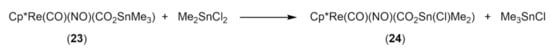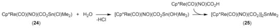 | [Cp*Re(CO)(NO)(CO2)]2SnMe2 (25) | na | 202.14 d | 1469, 1186 | [] |