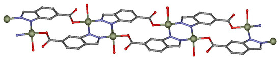 Representation of the 1D polymeric chain in which Zn2N4 planar six membered ring is observed (zinc, nitrogen, oxygen, and carbon are represented in green, blue, red, and grey, respectively; hydrogen atoms are omitted for clarity).
