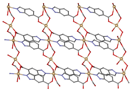 The reaction of 1H-indazole-6-carboxylic acid gave rise to two compounds based on group 12 metals which exhibit a different structural dimensionality. In particular, the solvothermal reaction of the 1H-indazole-6-carboxylic acid ligand with zinc acetate salt (Zn(CH3COO)2) using a 1:2 molar ratio in a N,N-dimethylformamide/water (DMF/H2O) mixture afforded a 1D CP, namely 1 (see Experimental Section for further details). Similarly, the use of cadmium acetate salt (Cd(CH3COO)2) salt in the synthesis, successfully led to a 3D MOF, namely 2. This fact can be explained by the larger ion size of Cd(II), which may admit higher coordination numbers, involving the participation of additional ligands and increasing the metal-to-ligand connectivity.