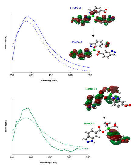 In order to get a deeper insight into the emission mechanism, TD-DFT calculations were performed on suitable models of compounds 1 and 2. The calculated spectra reproduce fairly well the experimental ones, indicating that the process is driven by singlet transitions occurring between the molecular orbitals shown in Figure 5. In both cases, the electron density in HOMO orbitals, HOMO-2 and HOMO-4 for compound 1 and 2, respectively, extend over the bonds over the whole ligand molecule (signifying a π orbital) whereas LUMO orbitals, LUMO+2 and LUMO+1 for compound 1 and 2, respectively, feature a π* character. Therefore, it can be stated that the transitions involved in the photoluminescence of compound 1 and 2 are mainly of π*←π nature induced by ligand centred emission.