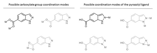 H2L is presented here as an ideal candidate to form CPs or MOFs as it possesses multiple coordination possibilities, not only derived from its carboxylate group, but also from its pyrazole function. Thus, a great variety of coordination modes are possible, according to similar ligands containing carboxylate and pyrazole chemical functions in crystallized complexes (Scheme 2). Until now, only one complex based on this ligand has been reported so far [11]. In that work, Kruger et al. described in detail four substituted indazole derivatives containing pyridine or carboxylic functionalities upon coordination with Cu(II) ions in solution and solid state. In the complex, 1H-indazole-6-carboxylate acts as a bridging ligand showing a tridentate coordination mode: the carboxylate group coordinates to two Cu(II) atoms in a syn,syn mode to establish a dimeric paddle-wheel shaped entity, whereas the non-protonated nitrogen atom of the pyrazole ring links to a third Cu(II) atom in a monodentate way (see the highlighted modes in Scheme 2). Aside from this work mainly focused on the description of a new compound, it should be pointed out that some Co(II)-based complexes with indazole derivatives have shown a capacity to bind to DNA [12].