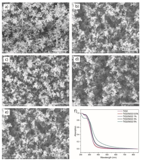 SEM images of (a) TiO2, (b) TiO2/SiO2 99.5/0.5, (c) TiO2/SiO2 99.0/1.0, (d) TiO2/SiO2 97.0/3.0, (e) TiO2/SiO2 95.0/5.0 and (f) UV-Vis absorption spectra of the corresponding samples.