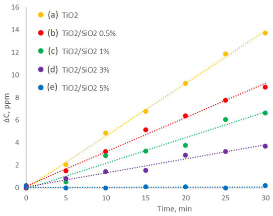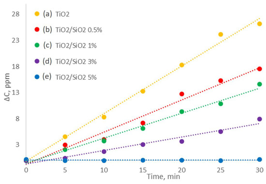 Measured photocatalytic activity of (a) TiO2 100% and TiO2/SiO2 multicompound nanoparticles with (b) TiO2/SiO2 99.5/0.5, (c) TiO2/SiO2 99.0/1.0, (d) TiO2/SiO2 97.0/3.0 and (e) TiO2/SiO2 95.0/5.0.