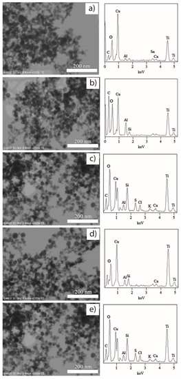 For a more detailed characterization of the multicompound nanoparticles scanning transmission electron microscopy (STEM) was used with energy-dispersive X-ray (EDS) mapping. Figure 3 shows the STEM images with the corresponding EDS profiles of multicompound TiO2/SiO2 nanoparticles. Figure 3a shows STEM images of pure TiO2 nanoparticles on microscope glass with average diameter of nanoparticles in range of 40–70 nm. Majority of nanoparticles have a spherical shape. The corresponding EDS profile verifies that nanoparticles consist of TiO2 (characteristic peaks at 4.5 and 5.0 keV). Signals of copper and aluminum originate from the sample holder grid (characteristic peaks at 0.9 and 1.4 keV). No SiO2 was observed as expected. Figure 3b,c display STEM images of TiO2/SiO2 99.5/1.5 and 99.0/1.0 samples, respectively. No significant changes were observed in the nanoparticle morphology but the EDS profile indicated presence of SiO2 characteristic peak (1.7 keV). Figure 3d shows the STEM image of TiO2/SiO2 97.0/3.0. The size of nanoparticles was in the same range (40-70 nm) but the EDS profile showed an increase of Si content. Finally, Figure 3e presents the STEM image of TiO2/SiO2 95.0/5.0. A small increase in the average diameter of nanoparticles (50–80 nm) was observed and the EDS profile displayed the highest amount of Si in all samples.