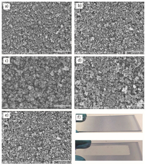 SEM images of (a) TiO2, (b) TiO2/SiO2 99.5/0.5, (c) TiO2/SiO2 99.0/1.0, (d) TiO2/SiO2 97.0/3.0 and (e) TiO2/SiO2 95.0/5.0 after tribological wear. Photographs of the nanoparticle deposited microscope glass before and after the tribological wear are shown in (f).