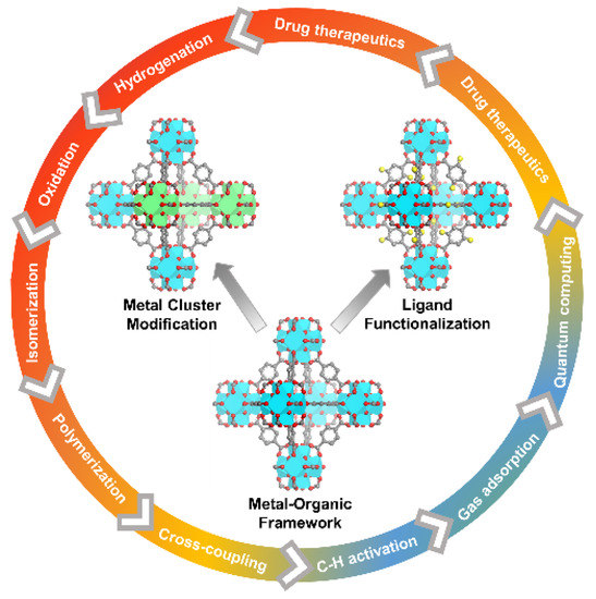 Catalytic transformations to design new and tailored commodity items have been of interest for many decades, both in the private, industrial, and academic world. This success is owed in part to the catalytic transformations of organometallic complexes, their functionalizable environments, and their active centers. Many important industrial processes that we rely upon in our modern lifestyle depend on the basic chemical transformations using organometallic chemical processes. In particular, the chemical transformations used to generate ammonia, synthesis gas, epoxyethane, sulfuric acid, nitric acid, and many polymer-based plastics involve an organometallic catalyst (iron, nickel, silver on alumina, vanadium, platinum and rhodium, and titanium respectively) [1]. It is estimated that 300 million tons of polymer-based plastics alone are produced globally each year at least in part from catalytic synthesis processes [2,3,4]. This area of research has long been a key feature in the modernization and globalization of our world as many of the everyday commodities we utilize are made through organometallic chemical processes. Thus, there are also many new approaches to design better and more effective ways of producing these commodities by further refining the organometallic catalytic processes that are utilized most heavily today. Among these approaches, Metal–organic frameworks (MOFs) have taken a central role in the improvement of organometallic catalytic research.