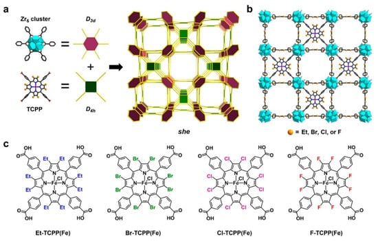 Figure 2. (a) Assembly of D3d and D4h nodes into (4,6)-connected she topological network. The Zr6 cluster and TCPP(Fe) ligand can be viewed as 6- and 4-connected nodes, respectively. (b) View down the tetragonal channels of R-PCN-224(Fe) (black, carbon; purple, iron; blue, nitrogen; hydrogen and chloride, omitted). The yellow spheres represent Et, Br, Cl, or F. (c) Chemical structures of Et-TCPP(Fe), Br-TCPP(Fe), Cl-TCPP(Fe), and F-TCPP(Fe) linkers. Adapted with permission from [29]; Published by American Chemical Society, 2017.