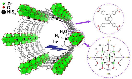 One commonly used technique for post-synthetic metalation is the use of AIM [60]. A famous example of the use of AIM in MOFs comes from the Hupp and Farha groups. In their work, they demonstrated the usability of NiS as a grafting material onto Zr6 metal nodes in NU-1000 (Figure 5). In this method, nickel and sulfur precursors are vaporized and are deposited onto the MOF framework. The nickel binds to the hydroxyl/aqua ligand pairs in the first deposition step, and sulfur binds to the nickel in the second step [60]. Interestingly, the nickel species deposited by AIM are not distributed evenly across the structure. Clusters of nickel in the NU-1000 modified material were shown to gather predominantly within the smaller pores of the NU-1000 structure [61]. Following the deposition of nickel sulfide, the material could be used for photocatalytic water splitting experiments. It was found that the parent NU-1000 framework could not perform water splitting, but the NiS@NU-1000 composite material was highly active, evolving a significant amount of H2 [60]. In addition to Ni, other metals have also been deposited using AIM, including Mo, Nb, and Co [62,63,64].