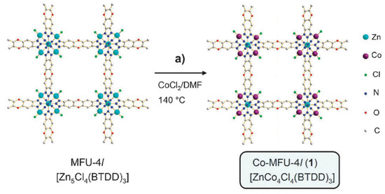 An important advantage for PSME is that it can be used to generate MOFs which are unable to be synthesized in a particular topology. Recent work in the Volkmer and Dinca groups has shown the usability of PSME for zinc MOF metal substitutions. MFU-4l (MFU = metal–organic framework, Ulm University), a zinc MOF with five zinc(II) cations in the cluster, is of topological and catalytic interest, but cannot be synthesized in situ with other metals beyond zinc [73,78]. Despite being unable to directly synthesize the isostructural MOFs of MFU-4l with other metals, PSME can be accomplished for the peripheral zinc ions with titanium, chromium, and cobalt (Figure 6) [73,75,78]. Substitution of the zinc ions with more active heterometal ions increased the activity of the MOF for a variety of catalytic applications, including: CO oxidation, olefin polymerization, and olefin insertion [73].
