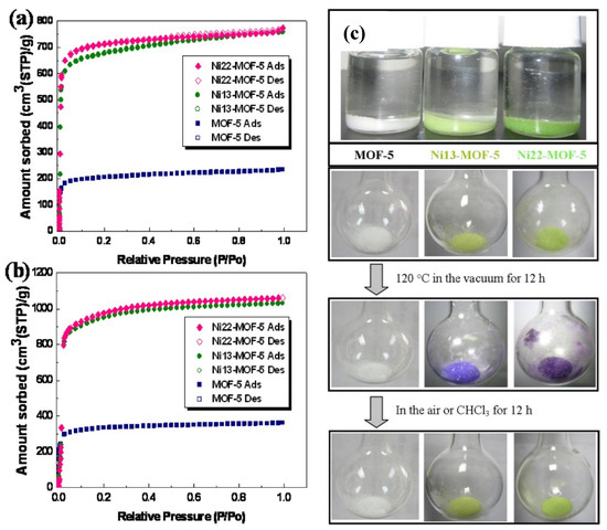 Figure 7. (a) N2 and (b) Ar sorption isotherms of MOF-5 and Ni-doped MOF-5 with varying amounts of Ni; (c) color change of MOF-5 and Ni-doped MOF-5 under vacuum and re-exposure to air of CHCl3. Adapted with permission from [84]; Published by American Chemical Society, 2012.