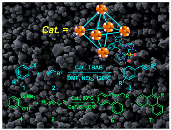 99. Wei, Y.-L.; Li, Y.; Chen, Y.-Q.; Dong, Y.; Yao, J.-J.; Han, X.-Y.; Dong, Y.-B. Pd(II)-NHDC-functionalized UiO-67 type MOF for catalyzing Heck cross-coupling and intermolecular benzyne-benzyne-alkene insertion reactions. Inorg. Chem. 2018, 57, 4379–4386. [Google Scholar] [CrossRef]