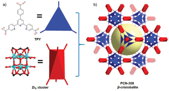 Figure 10. (a) Trigonal-planar organic linker TPY and six-connected D3d-symmetric Zr6 antiprismatic clusters. (b) The β-Cristobalite network of PCN-308 simulated based on the reported PCN-777 structure. Blue = TPY ligand, Red = Zr6 cluster, Yellow = void space. Adapted with permission from [111]; Published by Royal Society of Chemistry, 2019.