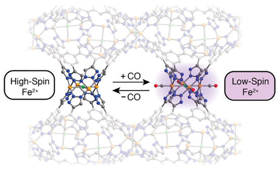 Figure 11. Reversible CO scavenging observed in MOF Fe3[(Fe4Cl)3(BTTri)8]2·18CH3OH (BTTri = 1,3,5-tris(1H-1,2,3-triazol-5-yl)benzene) driven by spin-state transition in Fe centers. Blue = N. Red = O. Yellow = Fe. Green = Cl. Grey = C. Adapted with permission from [119]; Published by American Chemical Society, 2016.