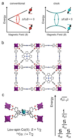 Figure 12. (a) Depiction of the clock concept for electronic spin qubits. Clock EPR transitions possess frequencies (f) that are insensitive to small changes in magnetic field (ΔB). This property may enable a long T2 in magnetically noisy environments relative to a conventional EPR transition. (b) Crystal structure of the parent [(TCPP)-Co]3[Zr6O4(OH)4(H2O)6]2 framework (TCPP = tetrakis(4-carboxyphenyl)-porphyrin) [128]. This material is porous, exhibiting a high surface area (∼3200 m2/g), and hosts paramagnetic cobalt(II) metal ions. (c) Close-up view of the square-planar cobalt(II) ions in the structure and qualitative depiction of the d-orbital splitting. The cobalt(II) ions are low-spin, featuring one unpaired electron that is strongly coupled to the I = 7/2 59Co nucleus. This strong hyperfine interaction engenders an avoided crossing such as that shown in (a). Purple = Zr. Cyan = Co. Grey = C. Red = O. Adapted with permission from [128]; Published by American Chemical Society, 2017.