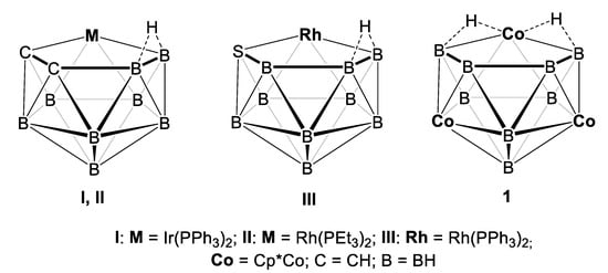 - Grimes, R.N. Transition Metal Metallacarbaboranes. In Comprehensive Organometallic Chemistry II; Abel, E.W., Stone, F.G.A., Wilkinson, G., Eds.; Pergamon Press: Oxford, UK, 1995; Volume 1, pp. 373–430. [Google Scholar]