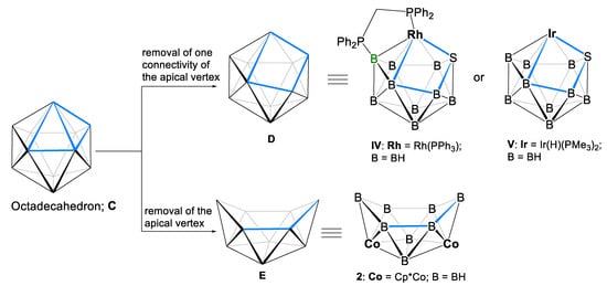 Schematic representation of stepwise generation of the 11-vertex isonido (D) and 10-vertex nido (E) cluster frameworks from an octadecahedron (C) and their examples.