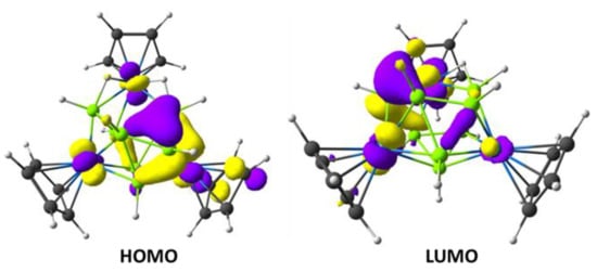 Density functional theory (DFT) calculations were carried out at the B3LYP/LANL2DZ level of theory (see computational details in Section 3) on model compound 1′ (Cp analogue of 1) to analyse the electronic structure and nature of bonding in the electron deficient molecule 1. Optimized bond distances in 1′ are in accordance with those experimentally measured for the solid-state structure of 1 (Table S1). The molecular orbital (MO) analysis of 1′ (Table S2) shows a large energy gap of 2.79 eV between the highest occupied molecular orbital (HOMO) and the lowest unoccupied molecular orbital (LUMO) in agreement with the electron count of 12 SEPs and the fact that only two bridging hydrogen atoms are present in the structure. The HOMO of 1′ is mainly localized on the metal centres and the five-connected inner-core boron atoms, whereas the LUMO is predominantly localized on the metal centres with considerable participation of the boron atoms of the open face of the cluster (Figure 4). We may wonder if cluster 1 could be reduced and reach the expected count of 13 SEPs to obey the PSEPT. It turns out that the LUMO + 1 is energetically close to the LUMO, separated only by 0.4 eV. This indicates that reduction of 1 is unlikely.