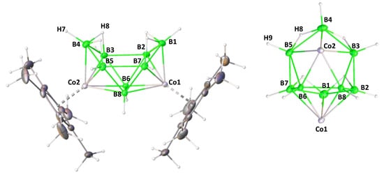 All of the experiments were conducted under an argon atmosphere using standard Schlenk and glove-box techniques. Solvents were distilled prior to use under argon. Cp*H, CoCl2, n-BuLi in hexane, LiBH4 (2.0 M in THF), BH3∙THF, and S powder were used as received (Sigma Aldrich, Bangalore, India). (Cp*CoCl)2 [,], [(Cp*Co)2B6H10] [], and Li[BH2S3] [,] were synthesized as per literature. Thin-layer chromatography, using silica gel TLC plates by Merck supported with 250-μm diameter aluminum, was done to separate the reaction mixtures. A 500 MHz Bruker FT-NMR spectrometer (Bruker, Billerica, MA, USA), JASCO FT/IR-4100 (JASCO, India) and Agilent Technologies: 6545-Q-TOF LC/MS (Agilent, Santa Clara, CA, USA) spectrometer were used respectively to record NMR, Infrared (IR) spectra, and ESI (Electronspray Ionization) mass. In 1H NMR spectra, the chemical shifts for residual protons in the deuterated solvents were used as reference (CDCl3, δ = 7.26 ppm, C6D6, δ = 7.16) while a sealed tube containing [Bu4N(B3H8)] [] in benzene-d6 (δB, ppm, −30.07) was used as an external reference for 11B{1H} NMR spectra. The light source for the photoreaction described in this report was Oriel Instrument with a 500 W Hg/Xe arc lamp equipped with liquid and colored glass filters, irradiating at 280–780 nm.