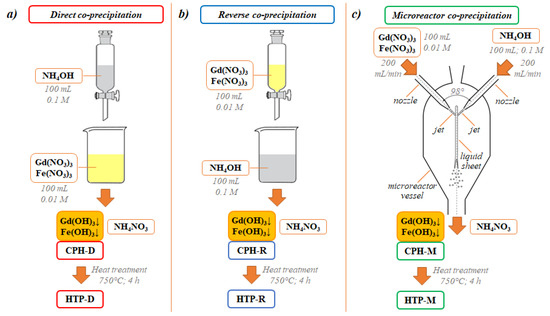 In this work, nanocrystals of gadolinium orthoferrite were synthesized by direct, reverse and ‘microreactor’ co-precipitation of gadolinium and iron(III) hydroxides at room temperature, followed by heat treatment of the obtained co-precipitated hydroxides in the air (Figure 1).