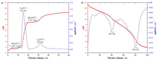 According to the obtained direct titration curve (Figure 2a, red curve), by adding the ammonia solution to the solution of gadolinium and iron(III) nitrates, the pH of the resulting solution gradually increases until the pH of precipitation (pHpr) of Fe3+ ions is reached. At this stage, the pH of the titrated solution does not change significantly, and the Fe3+ ions are precipitated in the form of iron(III) hydroxide. Thereafter, upon further addition of the ammonia solution, the pH of the resulting solution rises sharply until the pH of precipitation of Gd3+ ions is reached. At this stage, the pH of the titrated solution also does not change significantly, and the Gd3+ ions are precipitated in the form of gadolinium hydroxide.