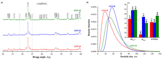 (a) X-ray diffraction patterns of the heat-treated products of co-precipitated hydroxides; (b) volume-weighted lognormal size distributions of the obtained GdFeO3 crystallites and comparison of their parameters (average crystallite size, maximum and FWHM values of size distributions).