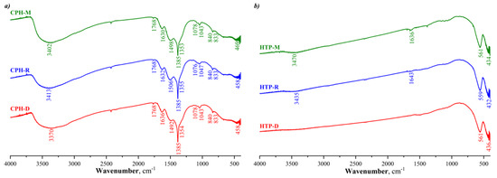 FTIR spectra of the samples of co-precipitated hydroxides (a) and their heat-treated products (b).
