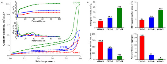 To estimate the specific surface area of the GdFeO3 nanocrystals and the pore sizes in the obtained samples, the measurements of low-temperature nitrogen adsorption-desorption isotherms were carried out. Figure 5a shows the results of these measurements, as well as the integral and differential surface areas depending on the pore width in the investigated samples.