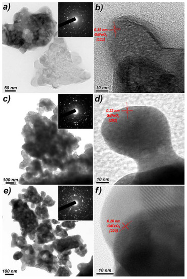 The morphology of individual GdFeO3 nanoparticles for all synthesized samples (Figure 6b,d,e) is close to isometric with a slight ellipsoidal distortion. The observed nanoparticles are single-crystal, which is confirmed by the presence of visually fixed atomic planes at high magnification (Figure 6b,d,f). In addition, the aggregates of GdFeO3 nanoparticles are completely crystalline, which is confirmed by the SAED results (see the insets in Figure 6a,c,e), which are typical for polycrystalline systems.