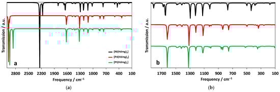 The O–H symmetric and asymmetric stretching modes in the calculated IR spectra of [Ni(Hdmg)2] are far lower (2174 and 2240 cm‒1) than those of [Pd(Hdmg)2] (2939 and 2964 cm‒1) and [Pt(Hdmg)2] (2857 and 2934 cm‒1) (Figure 2, Table 1, Table 2 and Table 3). The calculated values are perfectly in keeping with our calculated structural data and in line with increasing ionic radii for the metals (Pd2+ > Pt2+ >> Ni2+) [63,64,65,67] weakening the H bond. For the asymmetric O–H…O interactions this would lead to a shorter O–H bond and higher frequency [86]. Akin to a recent theoretical study [1], we also found that the asymmetric O–H stretching vibration in comparison with the symmetric stretching is very intense. This is in line with the bigger change of molecular dipole moment for the asymmetric O–H stretching mode.