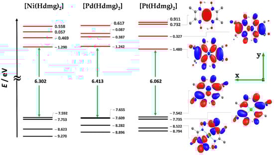 The calculated HOMO–LUMO energy gaps are 6.302 and 6.413 eV for the Ni and Pd complexes, respectively and reduced to 6.062 eV for the Pt complex, which is caused by a marked stabilisation of the LUMO (Figure 3). This series Pd > Ni > Pt agrees quite well with the experimental binding energies and electrochemical or optical HOMO-LUMO gaps of comparable series of Pt, Pd, and Ni complexes [63,64,65,67,77].