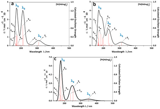 TD-DFT-calculated UV-vis absorption spectra of [Ni(Hdmg)2] (a), [Pd(Hdmg)2] (b), and [Pt(Hdmg)2] (c), (solvent: DMSO, functional: M06-2X, basis set: def2TZVP For C, H, N, O, LANL2DZ ecp for Ni, Pd and Pt.