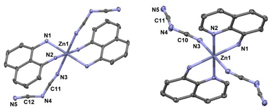 - Zhao, D.; Zhao, E.-X.; Huan, C.-A. Syntheses and characterizations of three new coordination compounds: [M(C9NH7)4(SCN)2] (M = Zn, Cd) and [Zn(C9NH7)2(SCN)2] with a pseudo-merohedral twinning structure. Synth. React. Inorg. Met. Org. Nano-Met. Chem. 2014, 44, 1390–1397. [Google Scholar] [CrossRef]
