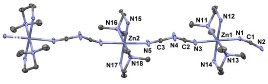 3.3.3. Catena-[Zn(isq)2(μ1,5-dca)2] (7) and Catena-[Zn(N,N-Me2en)(μ1,5-dca)]dca (8)