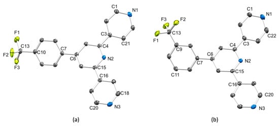 The molecular structures of (a) 1 and (b) one of the two crystallographically independent molecules of 2; the structure of the second molecule of 2 is similar to that shown. H atoms are omitted for clarity, and ellipsoids are drawn at 40% probability level. Selected bond lengths for 1: F1–C13 = 1.3292(16), F2–C13 = 1.3357(16), F3–C13 = 1.3372(16), C10–C13 = 1.4958(17), C6–C7 = 1.4859(16), C4–C3 = 1.4889(16), C15–C16 = 1.4930(17) Å. Selected bond lengths for 2 molecule 1: F1–C13 = 1.339(3), F2–C13 = 1.330(4), F3–C13 = 1.345(4), C9–C13 = 1.496(4), C7–C6 = 1.483(4), C3–C4 = 1.489(4), C15–C16 = 1.494(4) Å; the bond lengths in 2 molecule 2 are similar.
